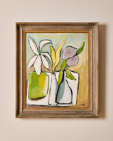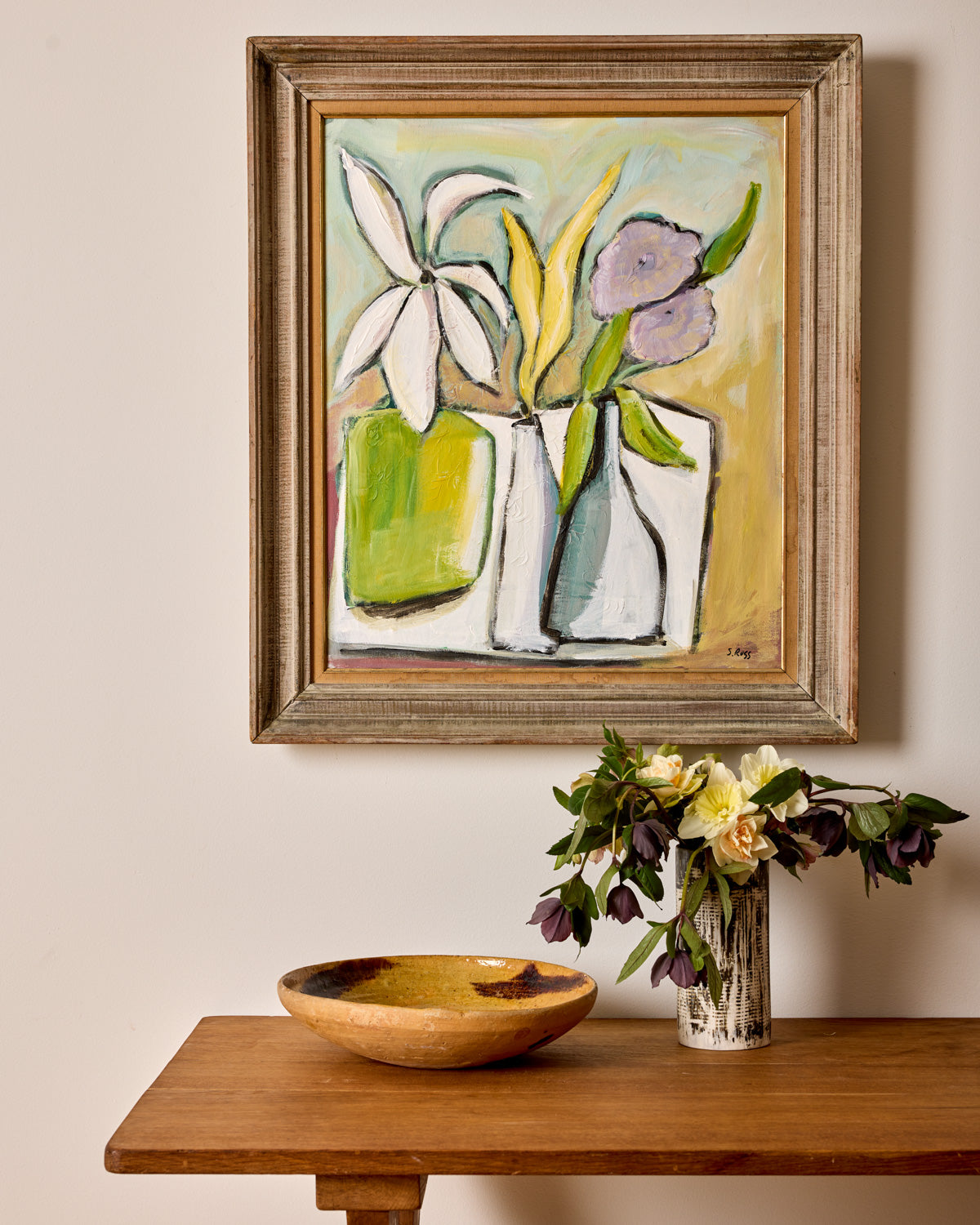 A vibrant still life by contemporary artist Stewart Ross. Bold strokes and rich color bring energy to a quiet scene — three vases filled with florals in shades of green and yellow. Signed and framed by the artist.