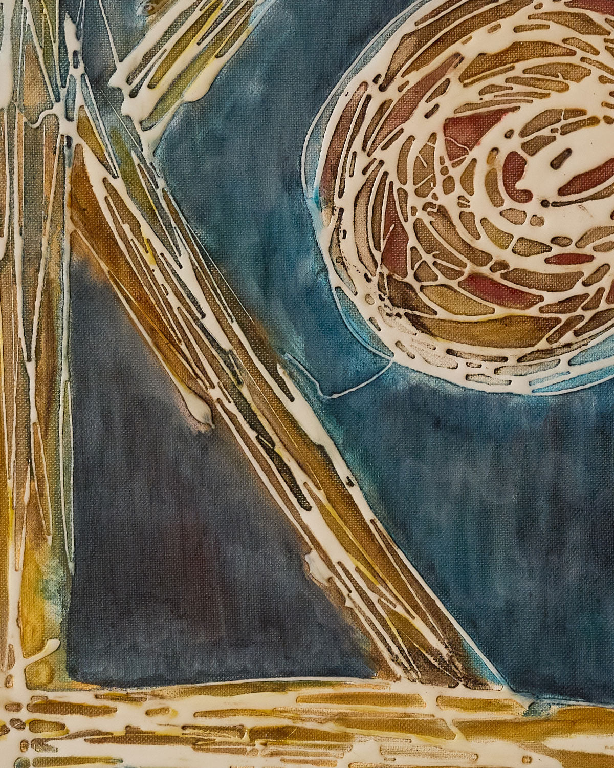 Titled Abstract on White II, this unframed canvas features a deep midnight blue background with bold yellow accents and a textured white overlay. The contrast between color and texture creates depth and movement. Signed by the artist.