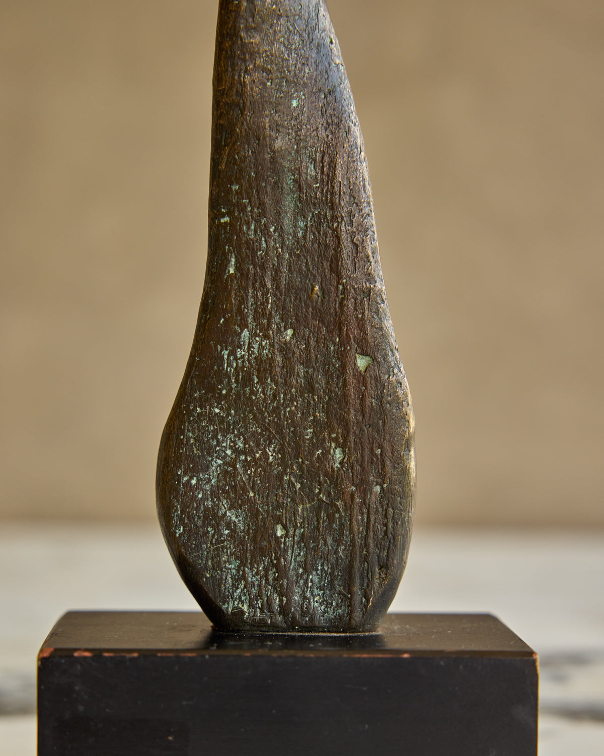 A twisted brass form rises from a simple black block base, its flattened curves catching light. The visible patina enriches its vintage character, lending depth and presence to this sculptural piece.