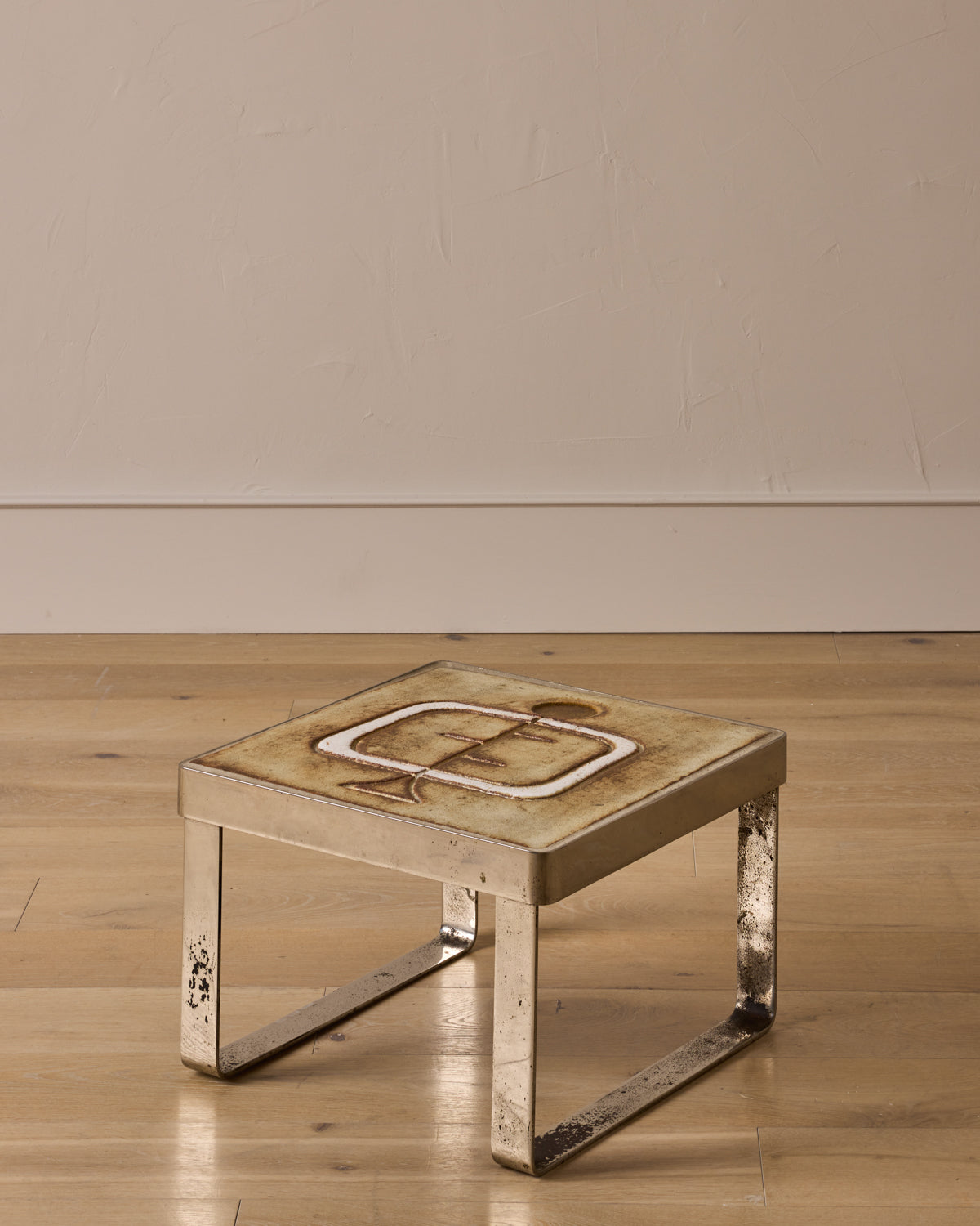 A 1970s French side table featuring an abstract ceramic top by artist Jean Grégorieff. The top is set within a polished chrome frame, supported by two curved legs that lend a sculptural presence.