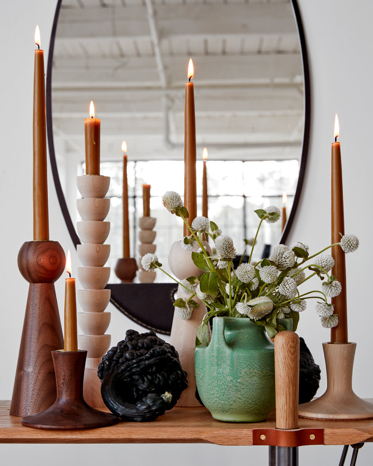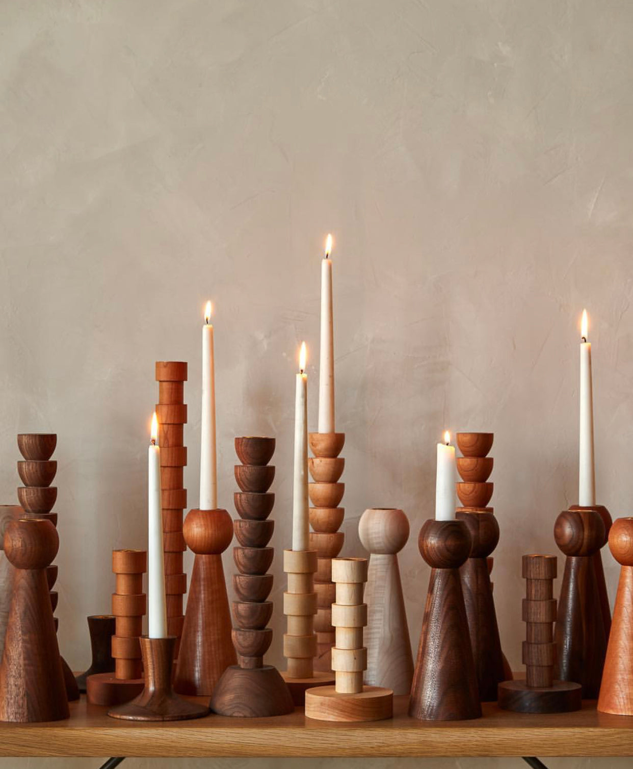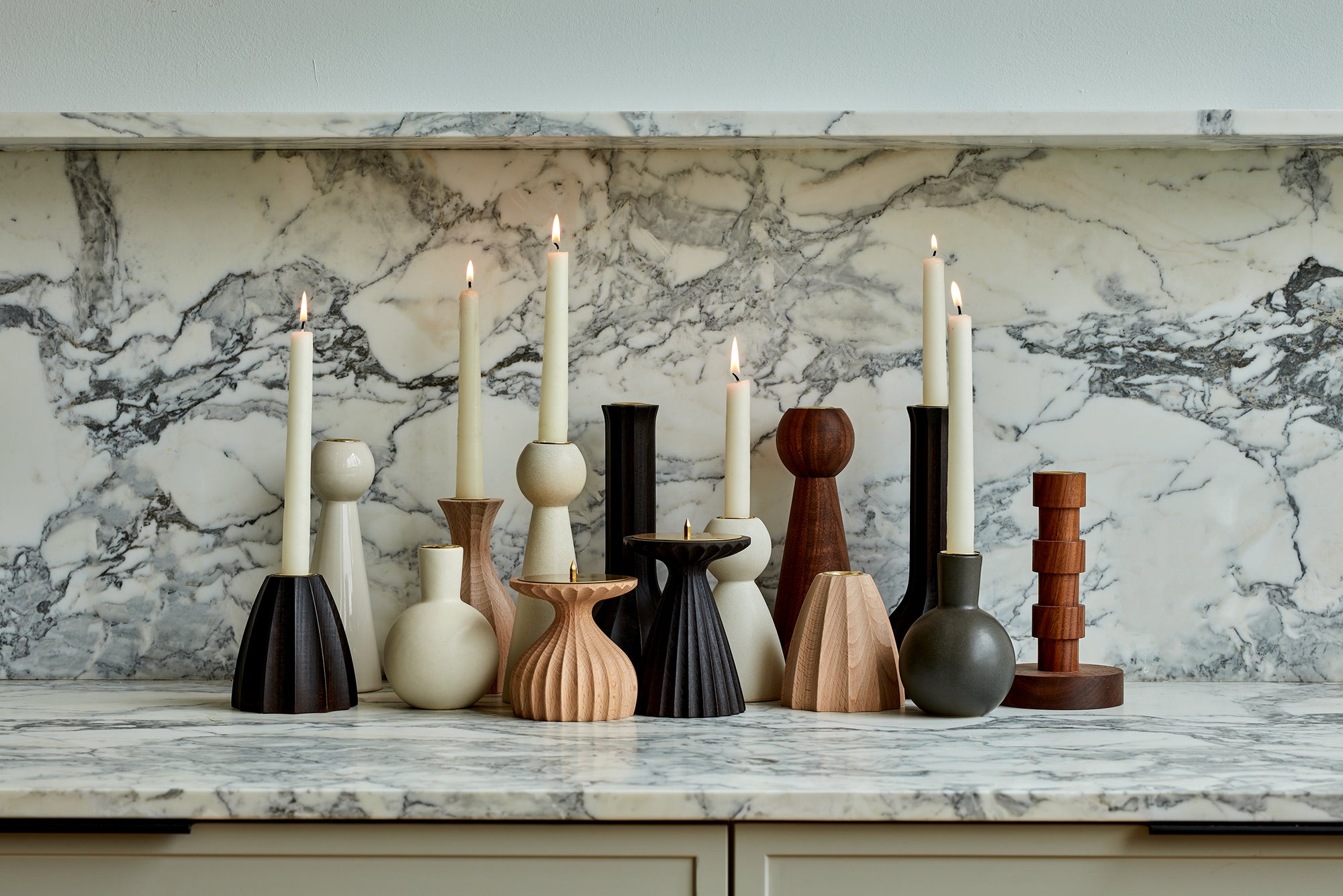 Handcrafted in the NPage Studio above the Lostine workshop, our Nesting Ceramic Candle Holder Quintet is a miniature collection, featuring five nesting candle holders in bold, minimal shapes and varying heights. Hand-built and glazed in a harmonious tonal palette of earthy browns and beiges, and offering various heights to group together into a candelabra style collection.