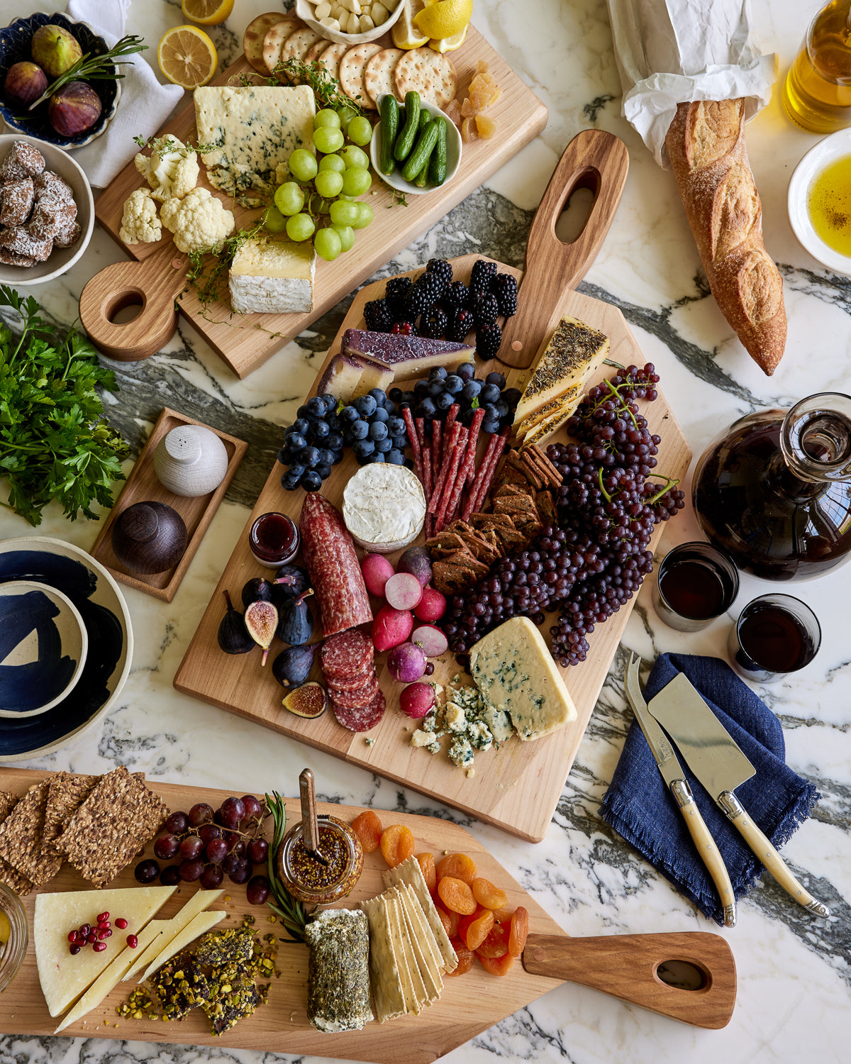 From preparation to presentation, elevate each step of the culinary experience with our new collection of cutting boards, inspired by thick European farmhouse style butcher blocks. These cutting boards are meant to live on your table, not just as tools, but a resting spot for all of your cooking essentials or on display as a charcuterie board for your next event. Made from solid maple, they are built to withstand the rigors of daily kitchen use without exception. Each cutting board is thoughtfully equipped with a sturdy handle, making it easy to transport and maneuver. The pieces are sturdy, substantial and designed to last for generations.