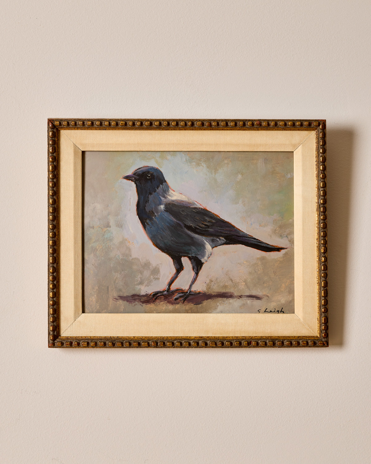 This study of a Grackle is painted with textural strokes and moody tonality. Set in a linen-lined frame, the piece brings a bold silhouette and sense of presence. Signed and titled on back.