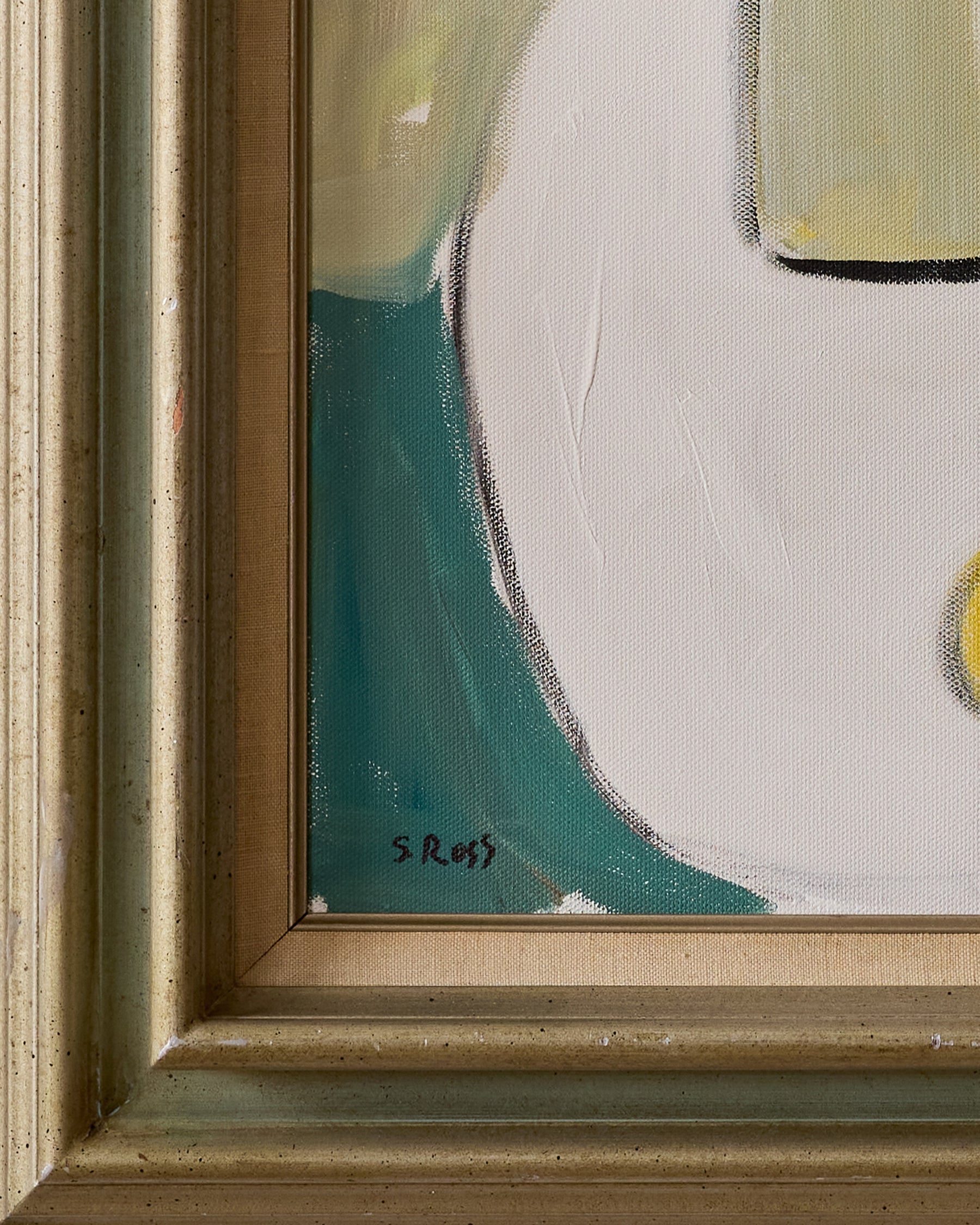 Lemons on Table by contemporary artist Stewart Ross is a still life depicting a bowl of vibrant lemons set on a table with a vase and chairs nearby. The simple, balanced composition captures the quiet beauty of everyday objects. Signed, titled and framed by the artist, this piece offers timeless charm and subtle elegance.