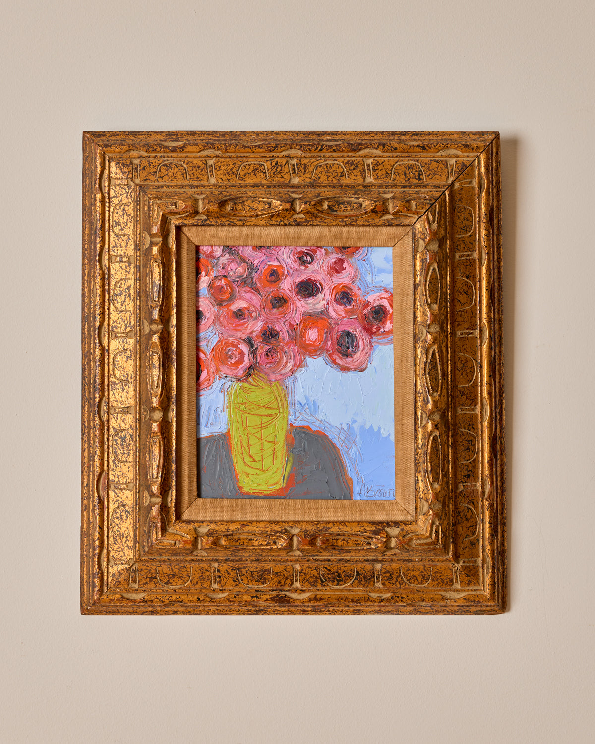 An original oil painting by contemporary artist Alex Brown, featuring large round pink blooms arranged in a green vase. Signed at bottom right and presented in a vintage carved giltwood frame, hand-selected by the artist.