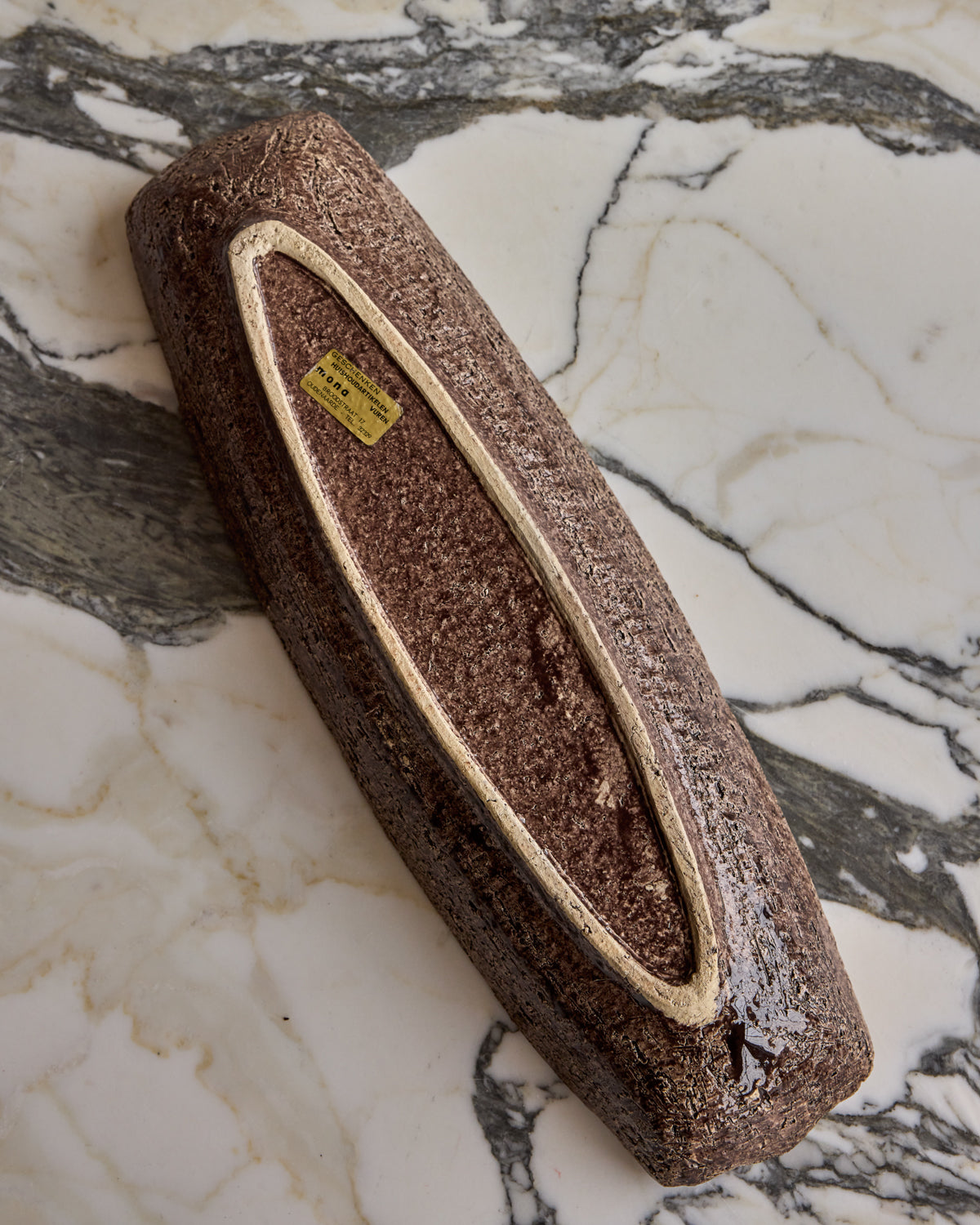 Long ceramic dish with a notched detail. The exterior features a raw, textured brown clay body, while the interior is finished in a glossy red glaze with subtle textural effects. Includes maker's stickers.