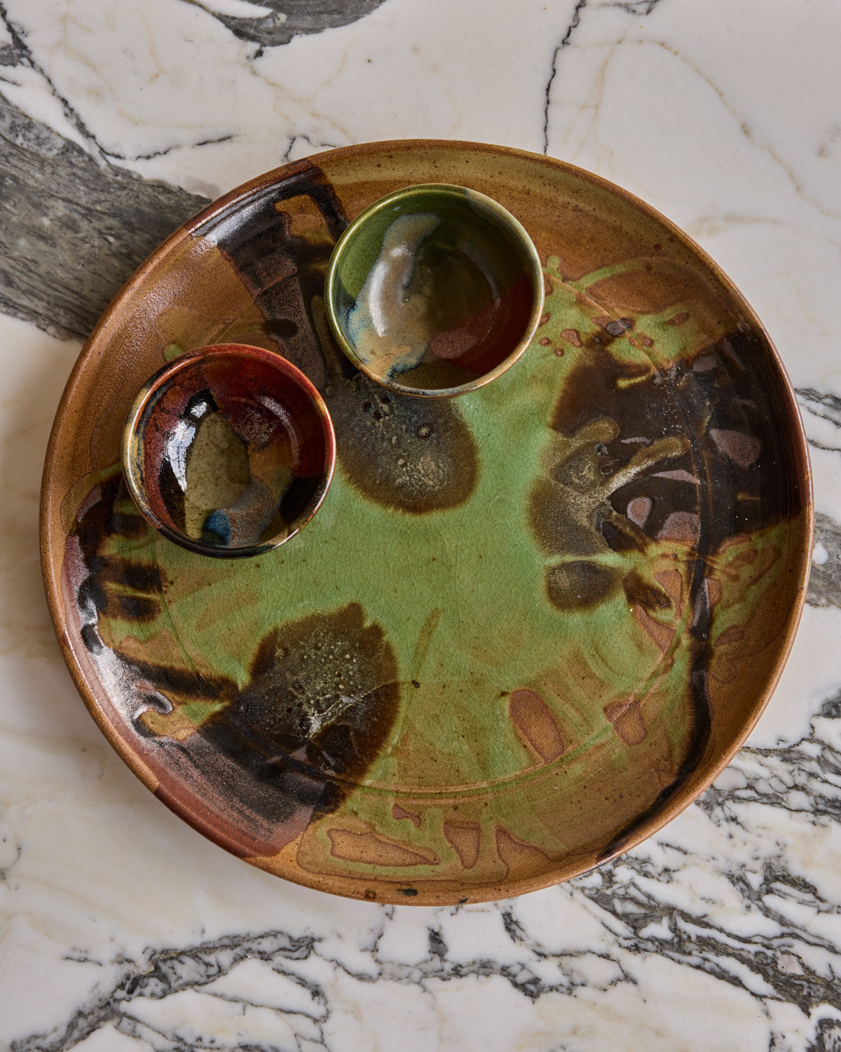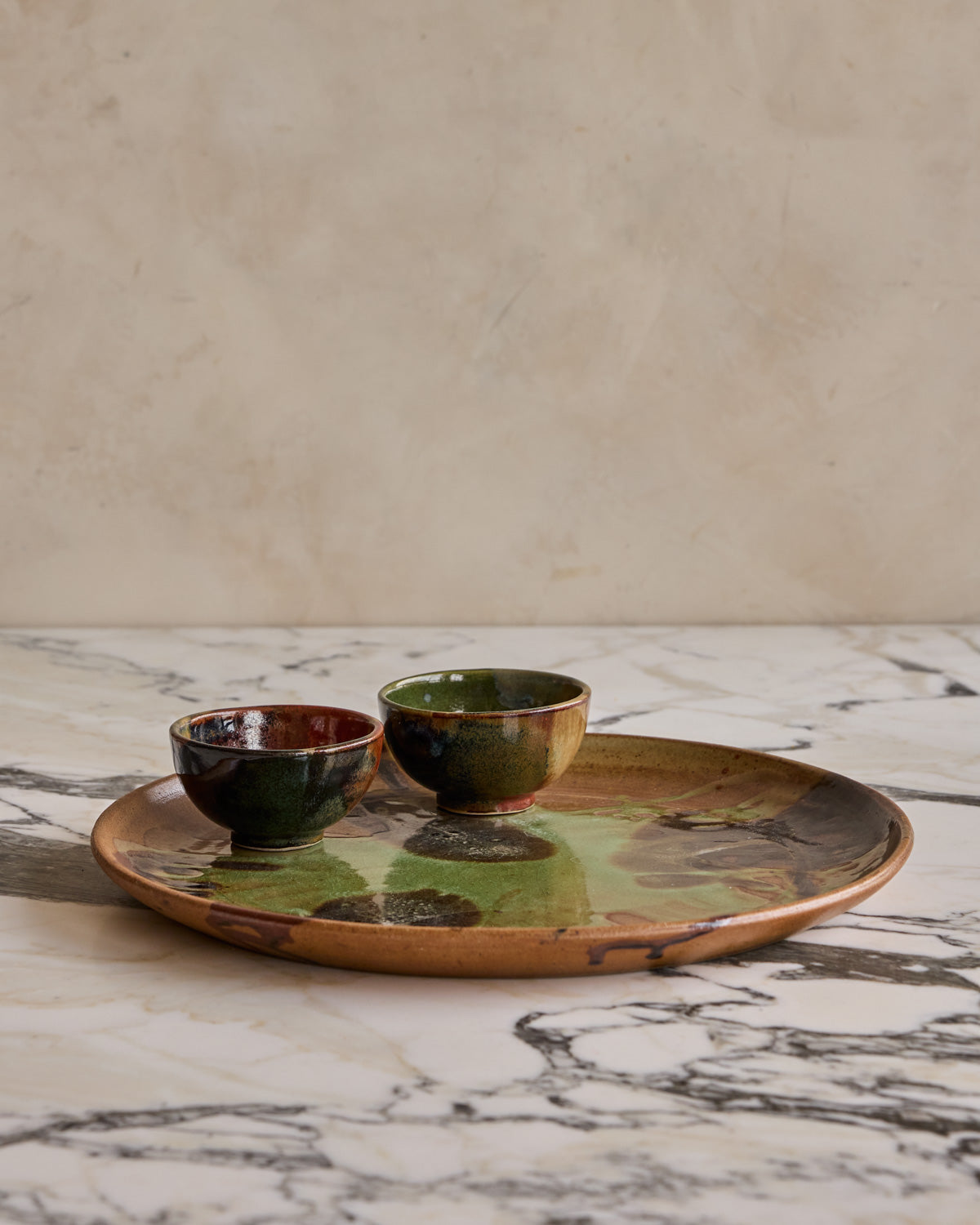 A ceramic serving tray with two small rounded cups. Glossy glaze blends green, brown, and black tones. Cups are ideal for sauces or small servings. All pieces are hand-thrown with visible glaze movement and unglazed undersides.