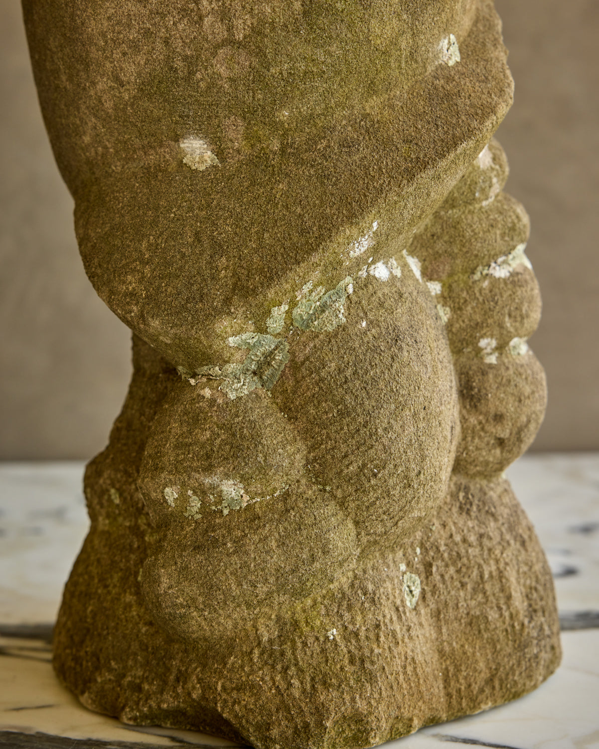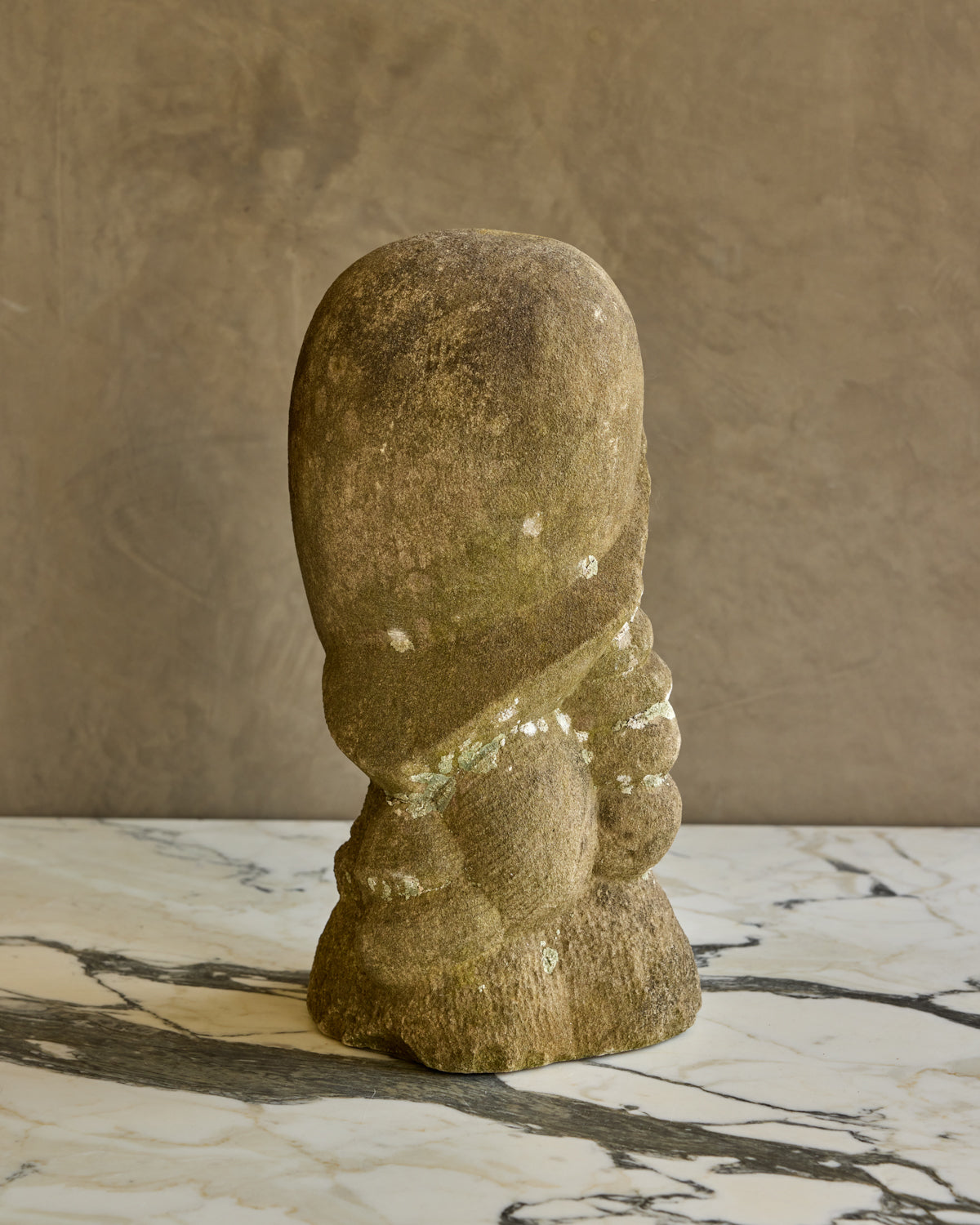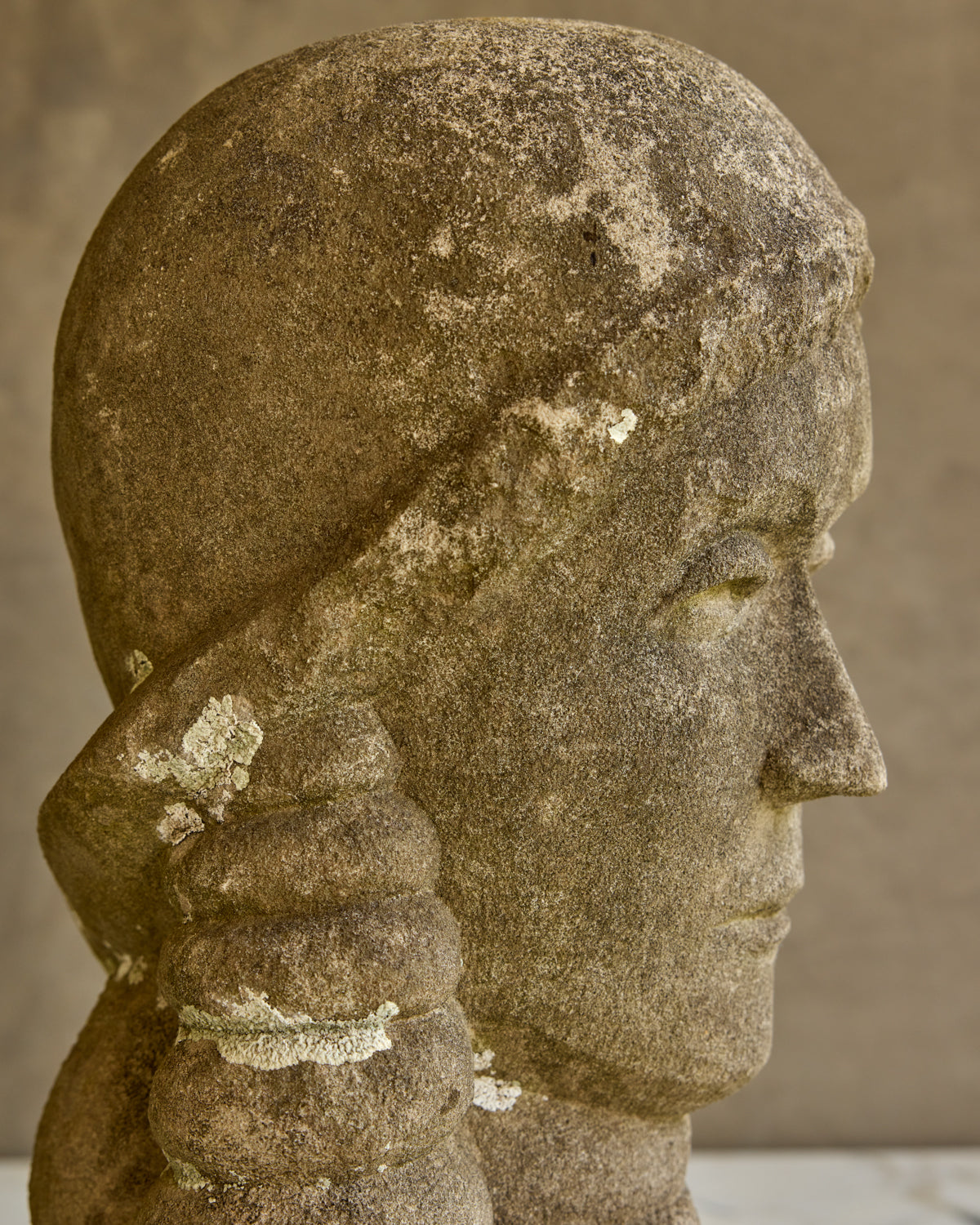 A weathered limestone bust with a quiet, timeworn presence. The face is rendered with softened features, framed by a sculpted braid that falls along the shoulder. The stone surface carries natural patina and lichen traces, lending depth and character. Small chips and irregularities are consistent with age and add to its tactile quality.
